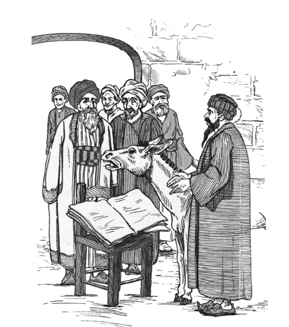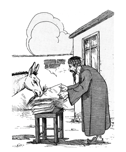 خر مې راوست، او ددغه کتاب مخې ته مې ودراوه، کله چې خره کتاب ولید ژر یې سترګې پکې خښې کړې، او په ژبه یې د کتاب پاڼې یوه پر بله پسې اړولې، آن تر دې چې د کتاب وروستۍ پاڼه یې هم واړوله.